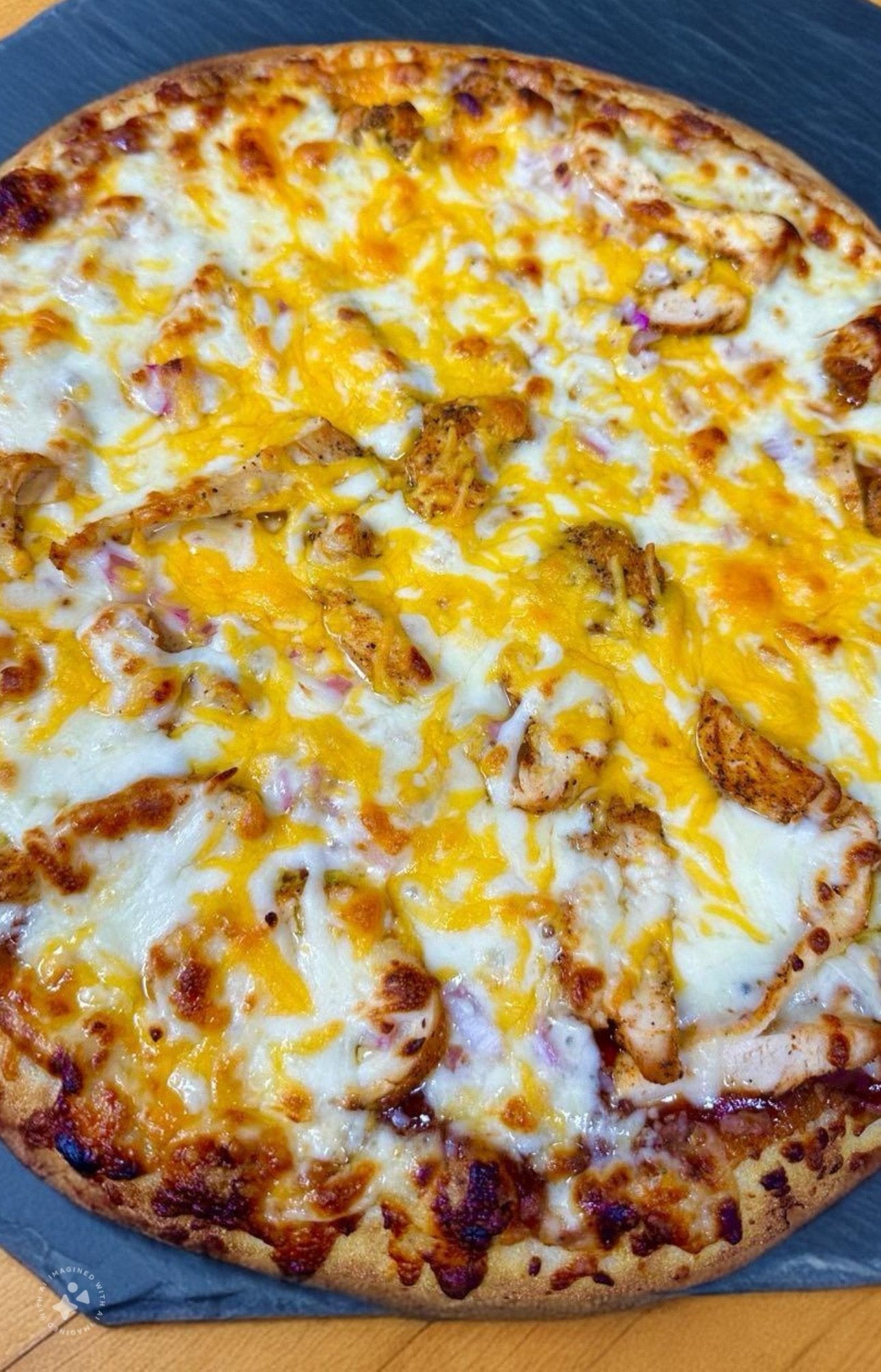BBQ sauce, grilled chicken, red onions, cheddar cheese, extra shredded mozzarella.